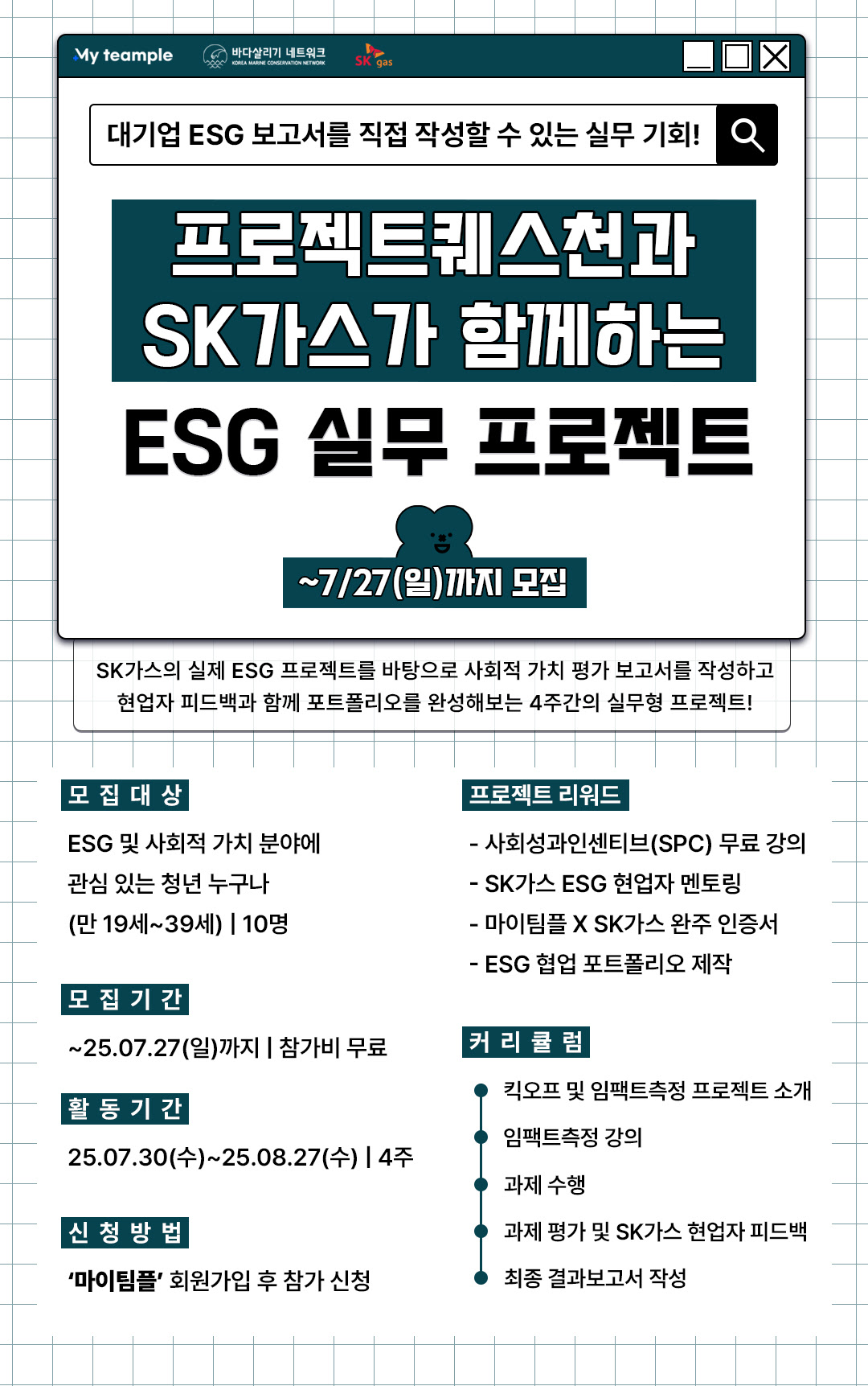 MyTeample (Operator: Project Question), a job experience-based training platform, announced that it is recruiting participants for the ESG practical training program with SK Gas. Participants are job seekers or new members of society who are interested in ESG and social fields, and applications can be made through the MyTeample website until the 28th of this month.