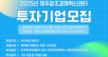 제주창조경제혁신센터(센터장 이병선, 이하 제주센터)는 제주 전략산업과 연계해 성장 가능성이 높은 유망 스타트업을 발굴하고 지원하기 위한 투자기업 모집에 나선다고 22일 밝혔다. 제주센터는 스타트업의 성장 단계에 따라 초기 단계부터 시리즈 투자까지 직접투자를 진행하며, 이를 통해 시장 진입 및 확장, 후속 투자 유치 등 기업의 성장을 체계적으로 지원한다는 계획이다. 투자 이후에는 ▲프리팁스(Pre-TIPS) 및 팁스(TIPS), 융자(LIPS) 연계 ▲재무·법률 전문가 컨설팅 ▲글로벌 진출 및 후속 투자사 연결 ▲업무공간 제공 및 주소지 등록 등 다양한 성장지원 프로그램을 제공한다. 모집 대상은 기술력과 사업성을 기반으로 시장 경쟁력을 갖춘 스타트업이나, 글로벌 시장 진출을 추진 중인 기업이다. 신청은 오는 7월 25일(금) 오후 5시까지 제주센터 공식 홈페이지를 통해 접수할 수 있으며, 최종 투자 계약은 9월 중 체결될 예정이다. 제주센터는 지금까지 총 46개사에 52억 6,000만 원 규모의 투자를 집행했다. 이 가운데 11개사는 제주센터 추천을 통해 중소벤처기업부의 기술창업 투자 프로그램인 팁스(TIPS)에, 3개사는 융자 연계 프로그램 립스(LIPS)에 선정됐다. 제주센터 관계자는 “센터의 직접투자와 후속지원 프로그램을 통해 유망 스타트업들이 안정적으로 성장할 수 있도록 돕고 있다”며 “올 하반기 투자 유치를 희망하는 스타트업의 많은 관심과 참여를 바란다”고 말했다. 관련 기사 더보기 https://www.venturesquare.net/994388