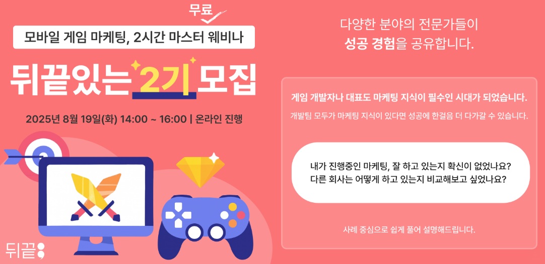 ‘모바일 게임 마케팅, 2시간 마스터 웨비나 – 뒤끝있는 2기’라는 이름으로 진행되는 이번 웨비나에서는 다양한 분야의 마케팅 전문가들이 게임 장르별 마케팅 전략과 실제 사례를 공유한다. 지난 4월에 열린 1기 웨비나 참여자들의 피드백을 반영해 보다 구체적이고 실무에 적용 가능한 내용으로 구성됐다.