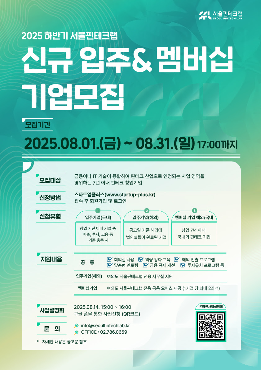 Applications can be submitted through the integrated startup support platform " Startup Plus ." Foreign companies can apply separately through the Seoul Fintech Lab website. An online pre-information session for prospective companies will be held from 3:00 PM to 4:00 PM on August 14th.
