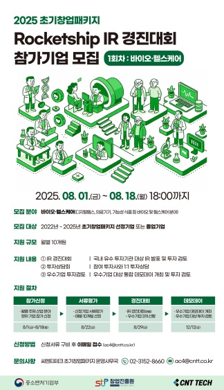 씨엔티테크(대표 전화성)는 8월 1일, ‘2025 초기창업패키지 로켓십 IR 경진대회’의 1회차 참가기업 모집을 시작한다고 밝혔다.