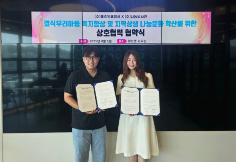 Azwemake Co., Ltd. (CEO Sooyoung Son), which operates the integrated management solution for digital transformation (DX) of grocery stores, Q Market, announced on the 11th that it has signed a business agreement with digital donation infrastructure startup Nanum Vitamin Co., Ltd. (CEO Hayeon Kim) to improve the welfare of children at risk of starvation and spread a culture of sharing and coexistence in the region.