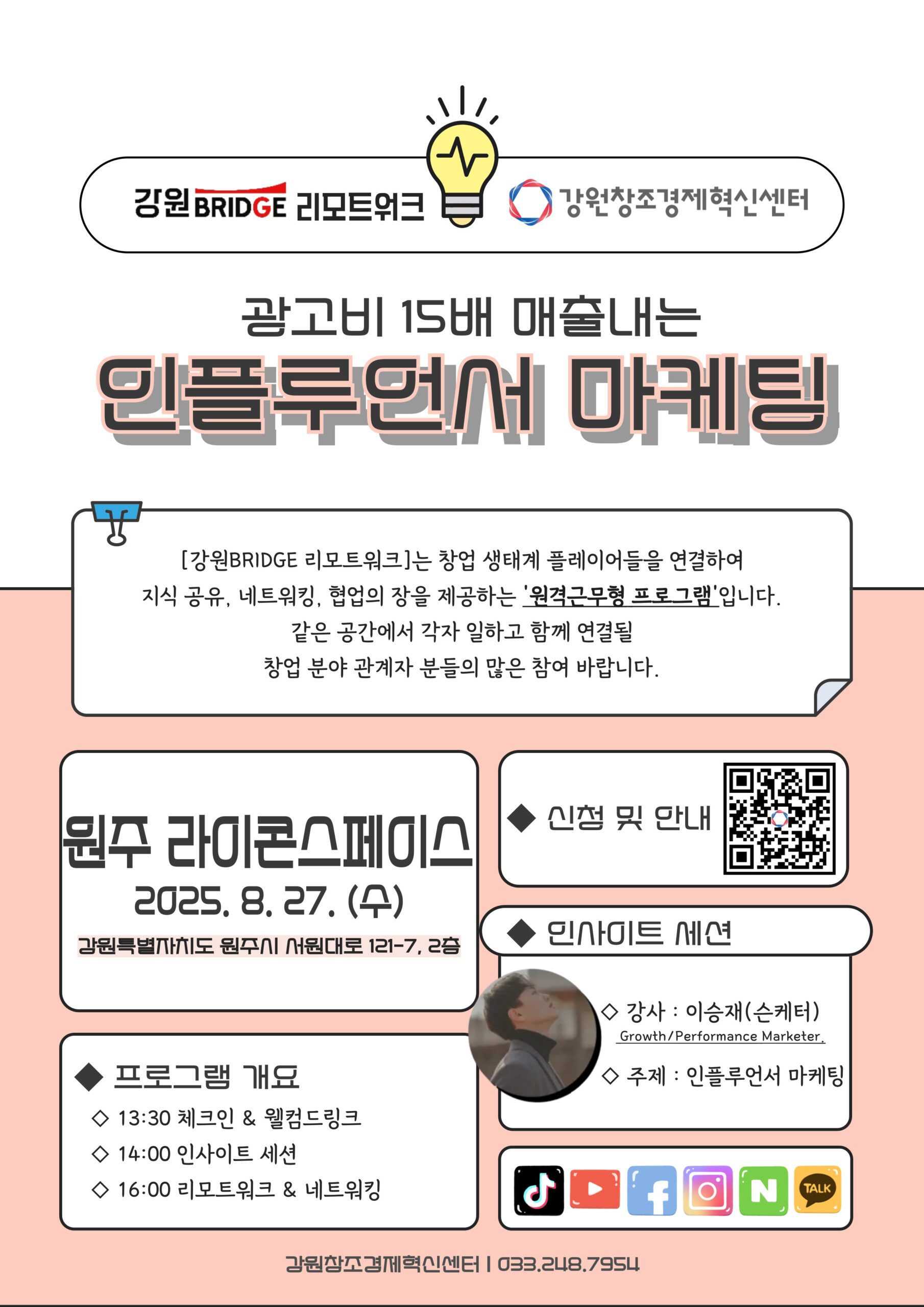 (재)강원창조경제혁신센터(대표이사 이해정, 이하 ‘강원혁신센터’)는 오는 27일, 원주에 위치한 라이콘스페이스에서 창업 생태계 플레이어 간의 지식 교류와 협업을 위한 ‘2025 강원BRIDGE 리모트워크(이하 리모트워크)’를 개최하고, 참가자를 모집한다고 밝혔다.