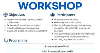 세계보건기구(WHO) 서태평양지역사무소(소장 Saia Ma’u Piukala)와 한국보건복지인재원(원장 배금주)이 오는 9월 11일 부산, 13일 서울에서 ‘Go WHO Korea Workshop’을 공동 개최한다. 이번 워크숍은 WHO 등 국제기구 진출을 희망하는 청년 인재를 대상으로, 채용 전략과 입사 정보를 제공하기 위해 마련됐다. WHO 서태평양지역사무소의 인사 담당자를 비롯한 현직 전문가들이 직접 참여해 채용 절차, 이력서 및 자기소개서 작성법, 인터뷰 전략 등 실무 중심의 정보를 전달할 예정이다. 참가자는 WHO의 조직 구조, 주요 인사제도, 부서별 역할 등 국제기구 근무와 관련된 실질적 내용을 강의를 통해 확인할 수 있으며, 현직 선배들의 진출 경험을 담은 영상 콘텐츠도 제공된다. 이번 워크숍은 부산(50명), 서울(170명) 규모로 진행되며, 국제보건 분야 진출에 관심 있는 청년 및 대학(원)생을 대상으로 한다. 참가비는 무료다. 한국보건복지인재원 배금주 원장은 “국제보건 분야로 진출하려는 청년 인재들에게 실질적인 가이드를 제공하는 자리가 될 것”이라며, “앞으로도 국제보건 역량 강화 프로그램을 지속 확대해 나가겠다”고 밝혔다. 관련 기사 더보기 https://www.venturesquare.net/998976
