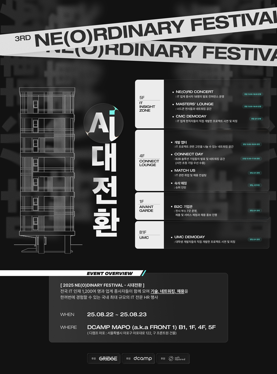 The "2025 Nerdinary Festival – AI Transformation," where developers and businesses collaborate to explore ways to respond to the proliferation of artificial intelligence (AI) technology, will be held at D.Camp Front One in Mapo-gu, Seoul, from August 22nd to 23rd. The event, co-hosted by D.Camp and Softsquared, is expected to attract approximately 1,200 IT professionals from across the country.