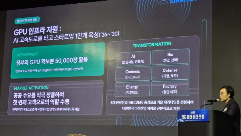 ハン・ソンスク長官はフォーラム中盤「ベンチャー・スタートアップ、ユニコーンを越えてK-ビッグテクロ」というテーマで未来戦略を発表した。提示された主な方向は▲高性能GPUなどAIインフラ拡充 ▲地域先端創業ハブ構築 ▲グローバル水準の補償体系強化 ▲冒険資本の好循環構造確立などで、ベンチャーが国家経済の成長動力であることを強調する内容が含まれた。