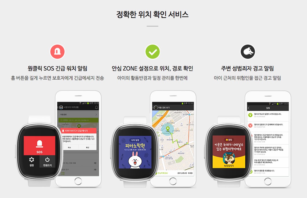 라인 키위워치는 다른 시장의 경쟁 제품들과 마찬가지로 아이의 위치 확인 서비스가 핵심입니다. 단순히 위치를 제공하는 것을 넘어서 긴급 호출이라던가 안심 존 설정을 통한 활동반경 관리, 특히 큰 문제가 되고 있는 성범죄자 관련한 위치 정보의 활용을 통해 아이들이 보다 안전해질 수 있도록 여러가지 응용된 기능을 제공하고 있습니다.