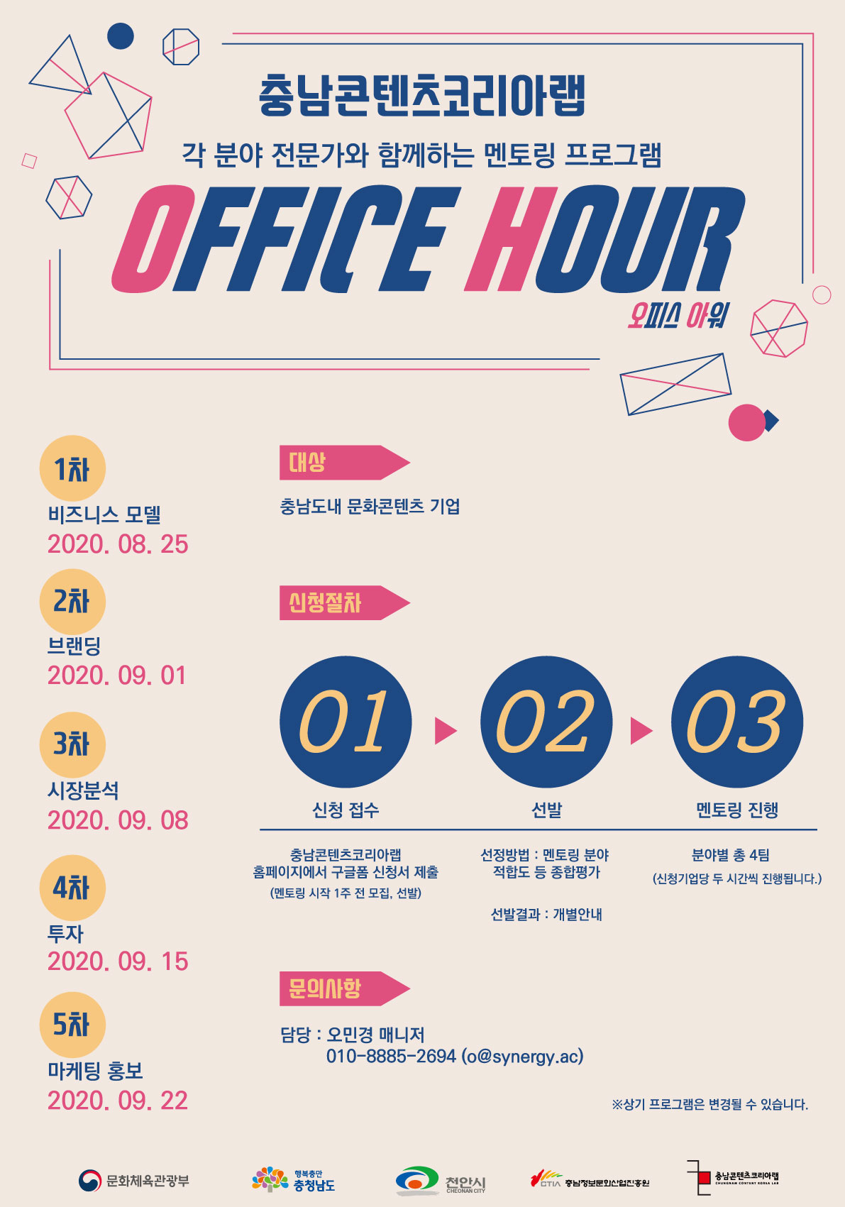 충남정보문화산업진흥원(이하 진흥원) 충남콘텐츠코리아랩은 충남도내 문화콘텐츠기업을 대상으로 ‘멘토링 프로그램(오피스아워)’ 참가자를 모집한다.