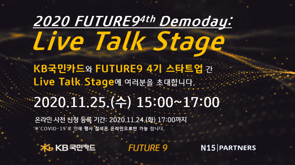 KB국민카드, FUTURE9, N15 Partners가 함께하는 2020 FUTURE9 Demoday: Live Talk Stage가 오는 11월 25일 수요일 15시에 진행된다. 온라인 웨비나로 진행되는 이번 행사는 KB국민카드 – FUTURE9 4기 스타트업 간의 협업 성과를 공유하는 자리다. 이번 행사에는 FUTURE9 4기 11개 팀이 참여하여 그간의 성과를 공유한다.