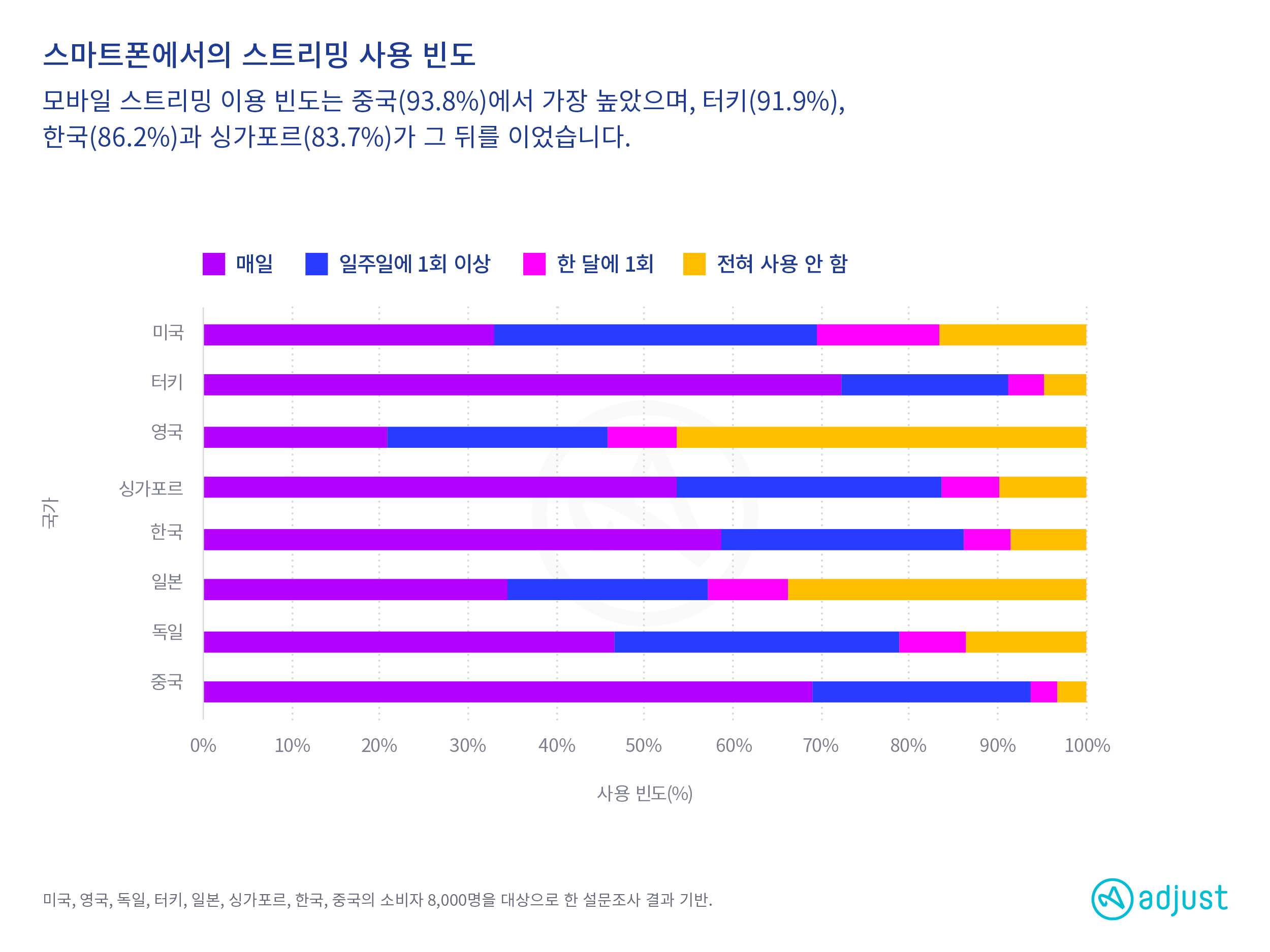 · 대부분의 소비자는 하루에 최소 한 번 이상 모바일 기기로 스트리밍 서비스를 사용하는 것으로 나타났다. 스트리밍 서비스 사용률이 가장 높은 국가는 중국(93.8%), 터키(91.9%), 한국(86.2%)으로 나타났으며, 미국(69.4%), 일본(57.2%), 영국(45.7%)이 그 뒤를 이었다.