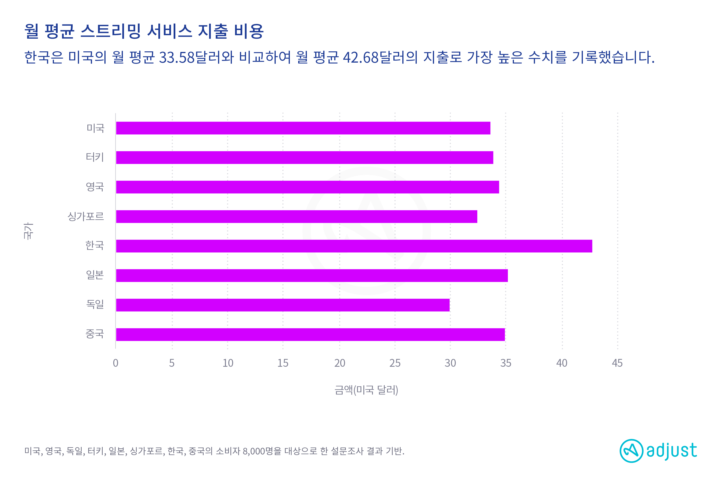 · 스트리밍 및 온디맨드 엔터테인먼트 서비스에 대한 지출이 많은 것으로 집계됐다. 미국(월 평균 33.58달러)와 영국(월 평균 34.82달러)에 비교하여 국내 소비자들의 지출 비용이 월 평균 42.68달러로 가장 높았다.