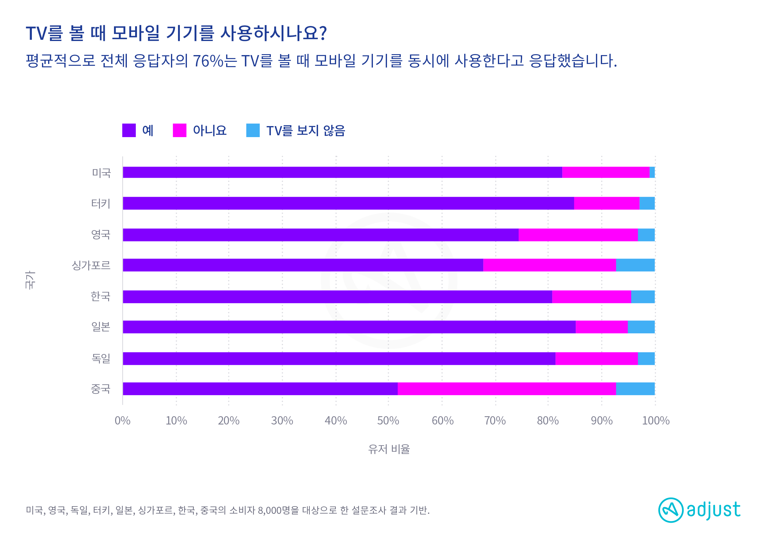 한편, 애드저스트는 커넥티드 TV(Connected TV; CTV)의 성장으로 세컨드 스크린(second-screen)의 사용이 전세계적으로 확산됐다고 밝혔다. 설문조사 응답자 중 76%가 TV 시청 중 모바일 기기를 사용한다고 답했으며, 이러한 경향은 싱가포르 및 중국(85%), 미국(83%), 한국(80.5%)에서 가장 많이 나타났다.