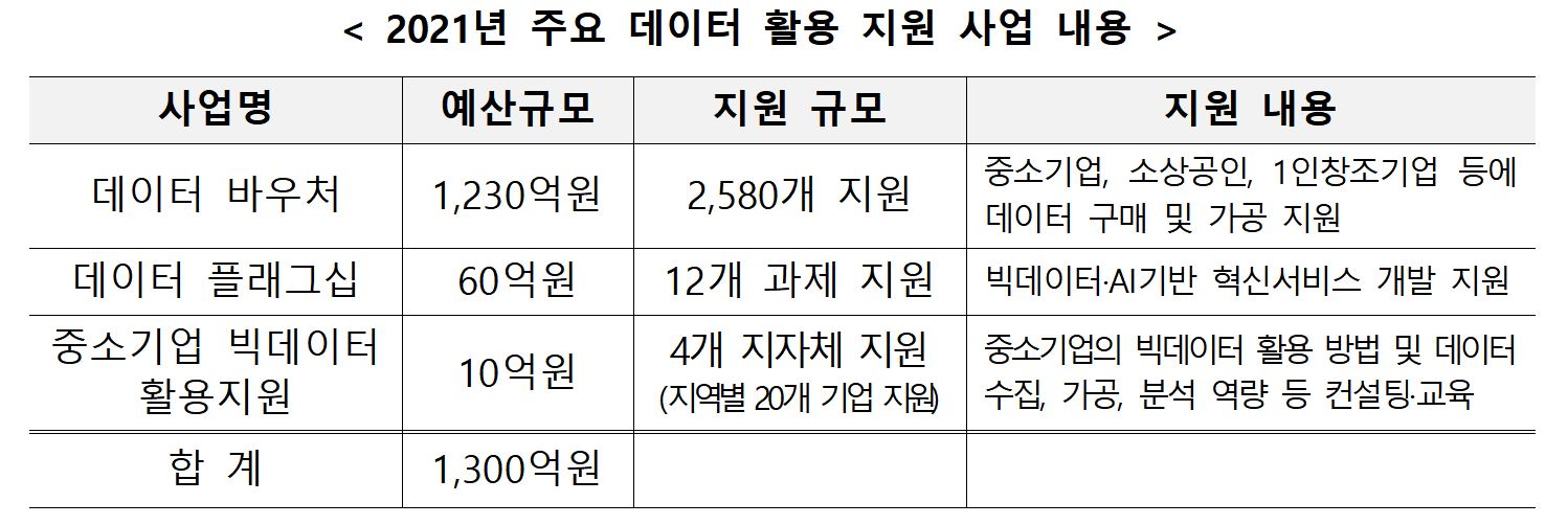 2019년부터 추진해 온 데이터 바우처 지원 사업은 중소기업·소상공인 등이 데이터를 활용하여 비즈니스 혁신 및 新제품‧서비스 개발시 필요한 데이터상품 또는 가공서비스 비용을 지원하는 사업으로, 올해 총 2,580개의 바우처(총 예산 1,230억원)를 지원한다.