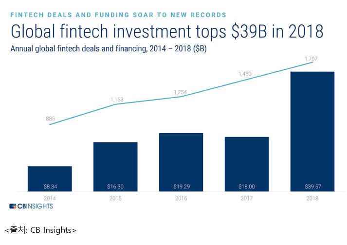 Recently, as global investments in startups have been active, the proportion of investments in fintech companies is increasing. According to CB Insights, the amount increased by 374.5% from $8.34 billion (2014) to $39.57 billion (2018), and the number of cases increased by 92.9% from 885 (2014) to 1,707 (2018).