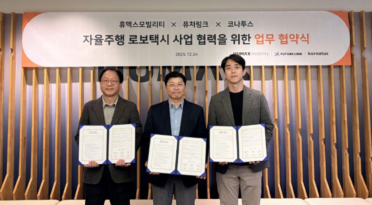 総合モビリティプラットフォーム企業ヒュマックスモビリティ、自律走行専門企業フューチャーリンク、タクシー呼びプラットフォーム運営会社コナトゥスがロボタクシーサービス導入と高度化のための業務協約(MOU)を締結した。