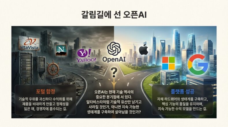 アルタビスタの事例が残した最も直接的な教訓は技術優位の有効期間だ。初期のアルタビスタの検索性能は競争相手が追いつきにくいレベルだったが、グーグルのページランクアルゴリズムが登場し、状況は急変した。現在オープンAIもグーグルのジェミナイ3、アンスロピックのクロードなどと激しい性能競争を行っている。かつて「何でも答えてくれる」GPTの経験は、業界のベースラインに近づいた。性能自体だけでは長期的な堀を構築しにくい環境になったわけだ。