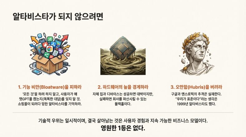 もう一つの共通リスクは拡張戦略です。 Alta Vistaは、検索の本質を維持するよりも、ニュース、ショッピング、電子メールを含むポータルに変身しようとしました。これはユーザーエクスペリエンスの分散につながりました。オープンAIもチャットGPTに検索、画像生成、コード作成、音声会話機能を統合し、機能非対話の兆しを見せている。プラットフォーム拡張という名分の下でサービスが重くなると、コア経験の鮮明度がぼやける可能性があるという点で同様の悩みが提起される。