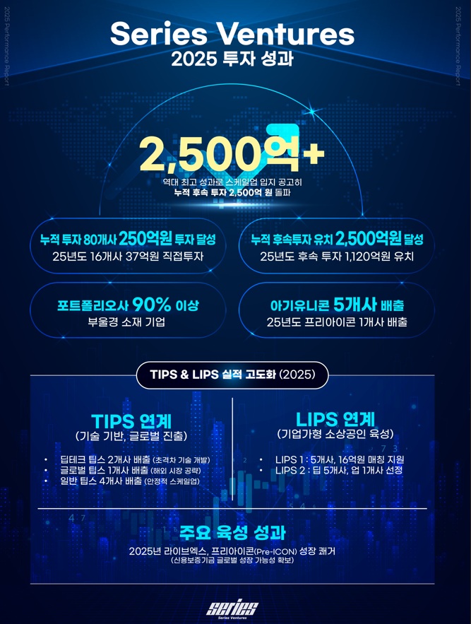 シリーズベンチャーズは現在まで約80の有望企業に合計250億ウォン規模の直接投資を執行した。 2025年には16社に37億ウォンの新規投資を断行し、ポートフォリオを拡大した。このような投資と育成成果をもとに、ポートフォリオ企業の企業価値が上昇し、市場競争力を強化している。