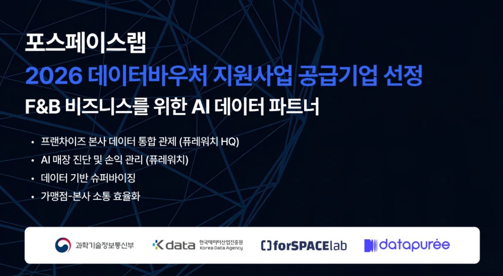 F&BビジネスのためのAIデータパートナーのフォースフェイスラップ(代表、スンヨンウク)が15日、科学技術情報通信部と韓国データ産業振興院が主管する「2026データバウチャー支援事業」の供給企業に選ばれたと明らかにした。