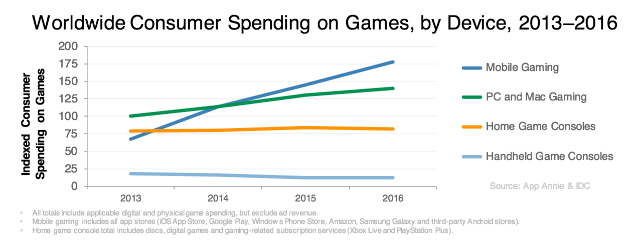 而且,手机游戏市场已经是一个每年都刷新纪录、呈现高增长势头的领域。明显的一个指标就是2014年消费者的支出分布。手机游戏的销售业绩超越家用机游戏和PC/MAC游戏业绩的时期是2014年,如今,移动手机游戏更是拉开了差距,2016年相比PC/MAC游戏多出25%,相比家用机游戏的销售额则是2倍以上,手机游戏就是这样从消费者的钱包里抢走金钱的。
