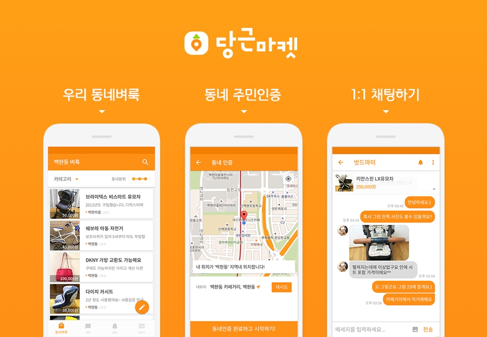 Daangn Market是以地区为对象的可以直接与社区居民们进行二手商品交易的C2C二手物品交易服务。通过GPS进行社区认证,在手机上登陆,通过实时聊天就可以进行物品交易。