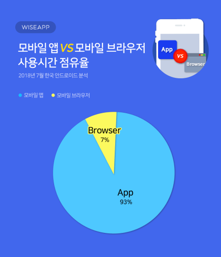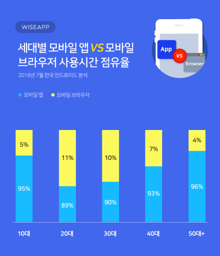 This sample survey was conducted with 23,000 Android users nationwide for the past month by Wiseapp and measured the time spent on the mobile browser and on every app available in the app store while the smartphone screen is turned on.